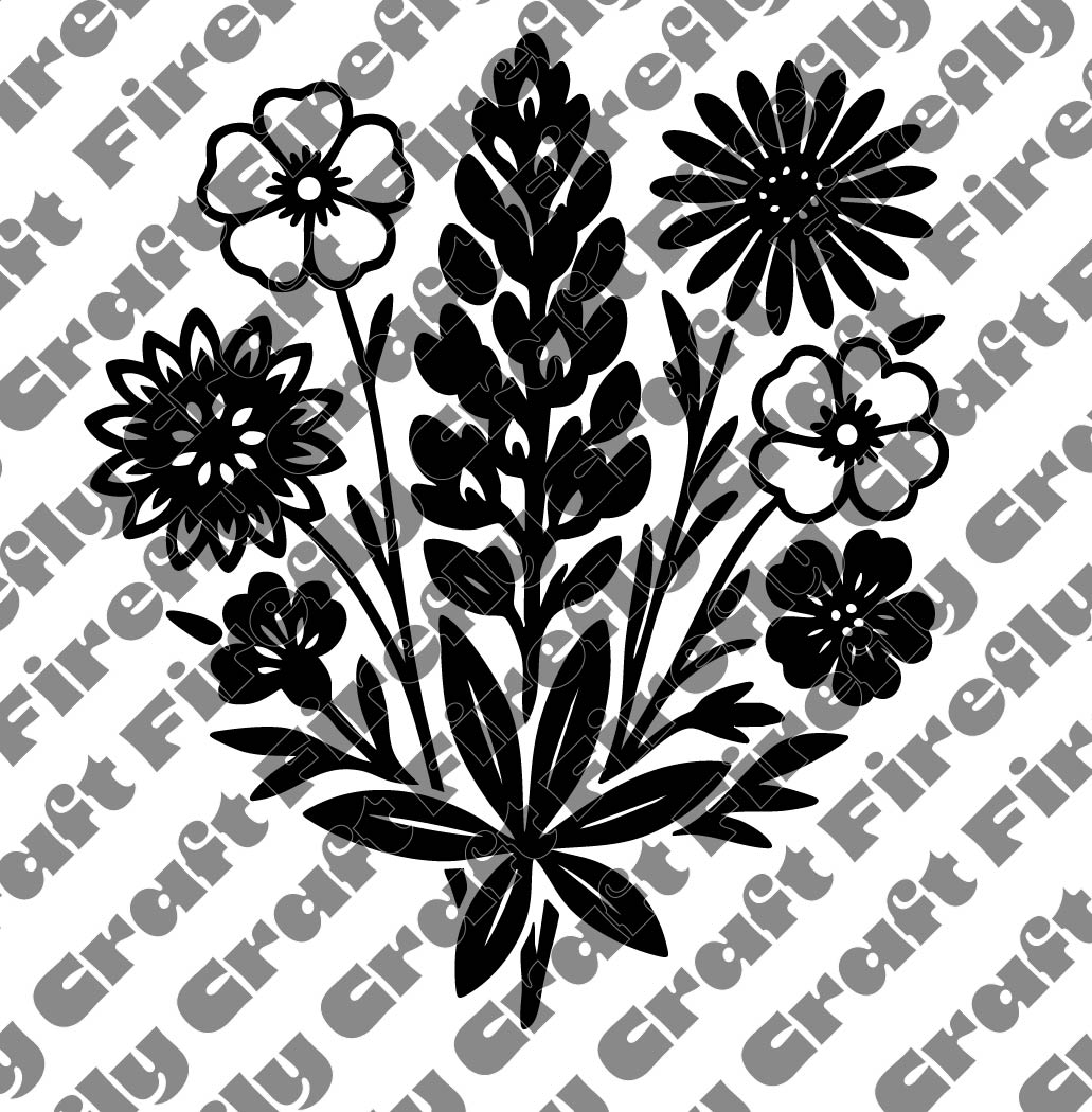 SVG File. A sweet assortment of Texas wildflowers arranged in a bouquet. Featuring a Texas Bluebonnet, fire wheel, evening primrose, buttercup, and daisy. Bold, clean, easy to weed line work.Ā